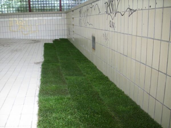 as deep as you can bringt einmalig acht KünstlerInnen an einem nahezu vergessenen Ort Berlins zusammen: der Schwimmhalle Pankow – seit fast 10 Jahren außer Betrieb und dem Verfall preisgegeben. Mit ortsbezogenen Installationen und Malereien kehrt nun endlich Leben in die gekachelte Halle zurück. Alle ausgestellten Werke spielen dabei auf ganz unterschiedliche Weise mit den Themen Natur und Künstlichkeit, Wildwuchs und Formstrenge, wie sie die Halle von außen und innen, heute und gestern prägen. as deep as you can lädt Künstler und Besucher also ein, gemeinsam einen Ort zu entdecken, der so viel bereithält für den, der bereit ist auch zweimal hinzuschauen. Wir unterstützen die Aktion mit der Lieferung und Verlegung von Rollrasen.